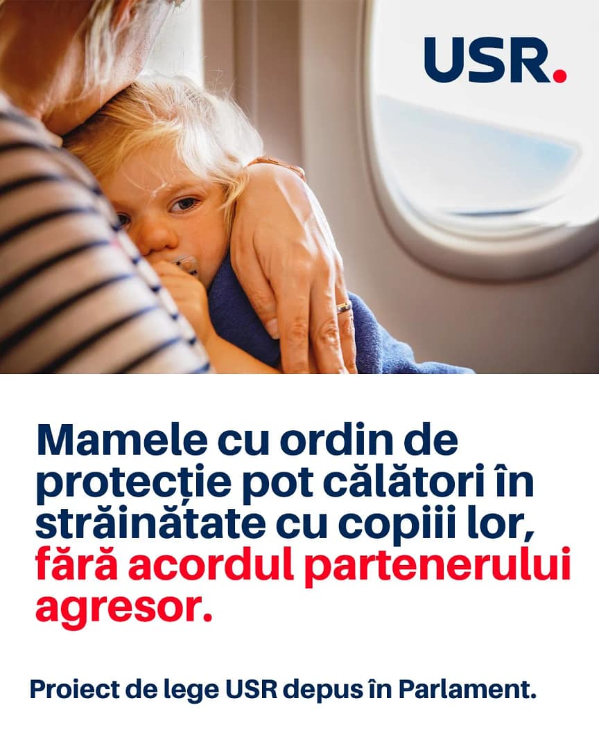 Modificarea cadrului legislativ propusă de USR în proiectul de lege constă în faptul că părintele care deține ordin de protecție va putea călători în străinătate însoțit de copilul minor, fără a fi nevoit să obțină de la părintele agresor declarația notarială.