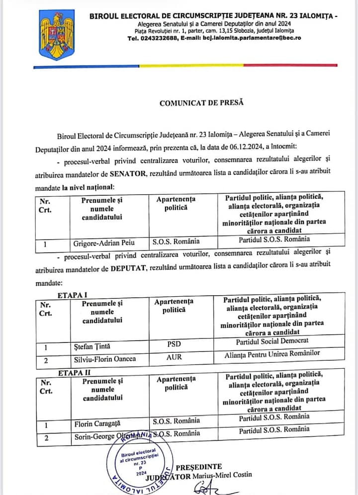 Pentru Senatul României, Biroul Electoral de Circumscripție nr. 23 Ialomița a anunțat atribuirea mandatului de senator obținut de urziceneanul Adrian Peiu, candidat din partea S.O.S. România.