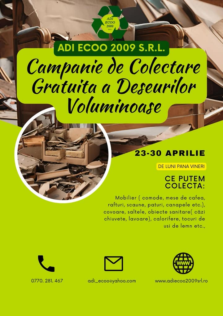♻️Campania de salubrizare este derulată având ca punct de plecare ideea că deșeurile voluminoase fac parte dintr-o categorie aparte, care nu trebuie aruncate în pubelele/containerele din curte sau din fața blocului. Datorită dimensiunilor mari, acestea e obligatoriu să fie colectate separat, gratuit, în cadrul campaniilor special organizate de operatorul ADI ECOO 2009 SRL, primăvara și toamna.