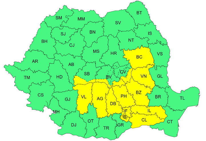 Codul galben este valabil și pentru zona de munte a județelor Covasna, Brașov și Sibiu dar și în Ilfov și Municipiul București.
