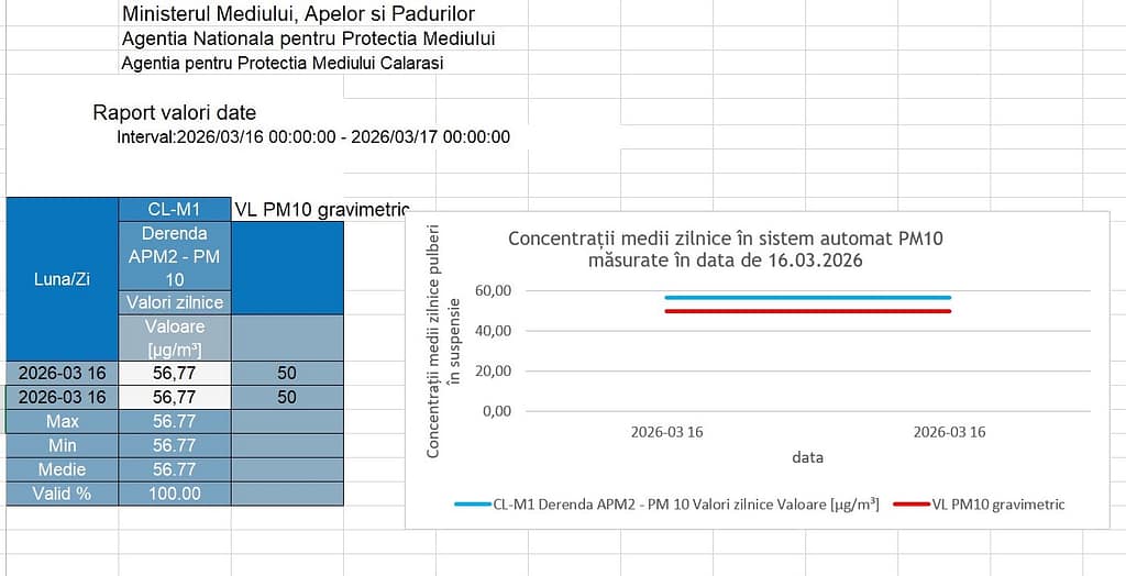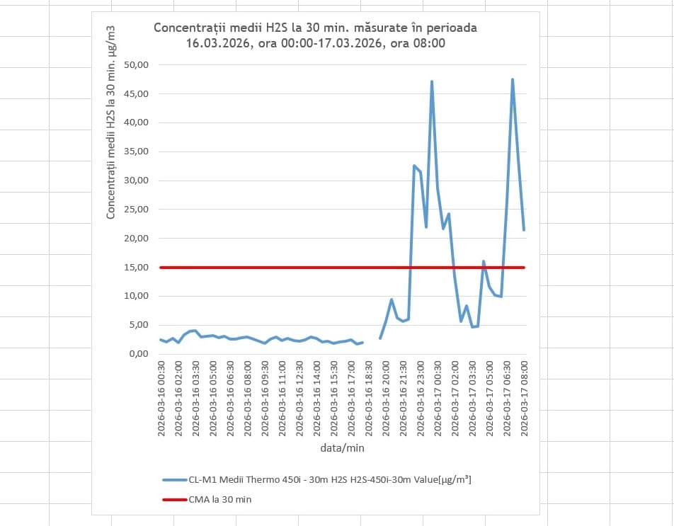 Aceste depășiri confirmă existența mirosului puternic, greu de suportat, specific acestui tip de gaz. În același timp, raportul indică și: depășirea valorii zilnice pentru particulele în suspensie PM10 în data de 16.03.2026.